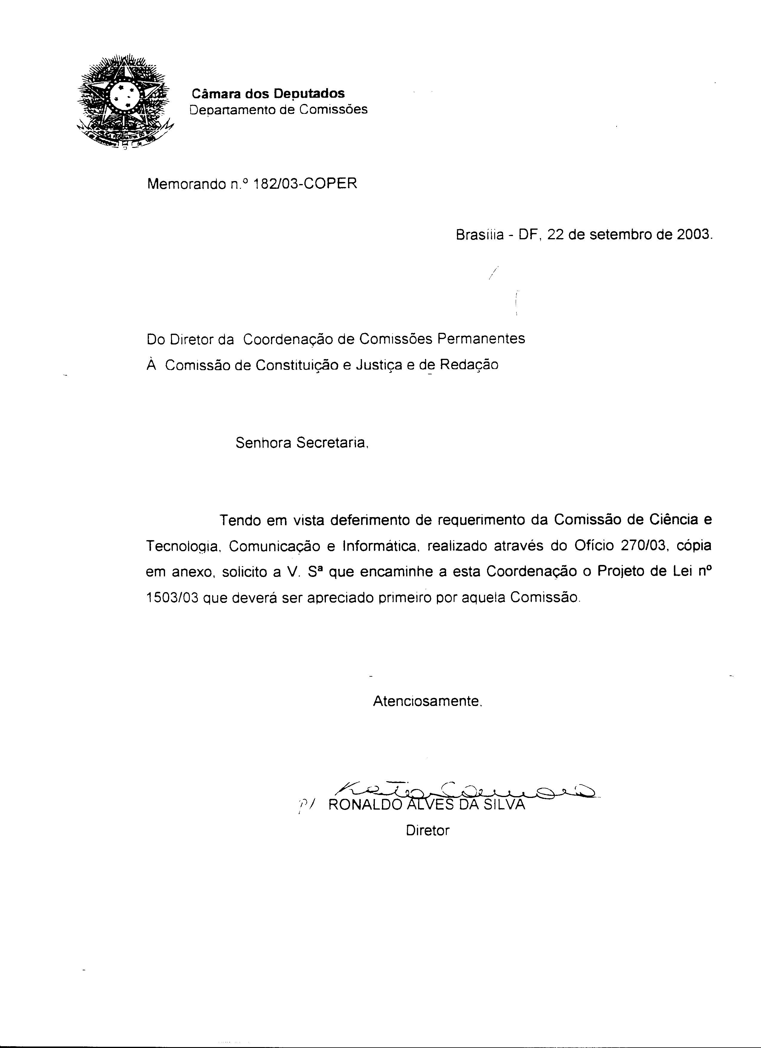 Documento 3 - Memorando 182/03, de 22/09/2003, da Coordenação de Comissões Permanentes (CCP) à Comissão de Constituição e Justiça (CCJR) comunicando que o PL 1.503/03 deveria ter seu mérito apreciado primeiro pela Comissão de Ciência e Tecnologia (CCTIC)