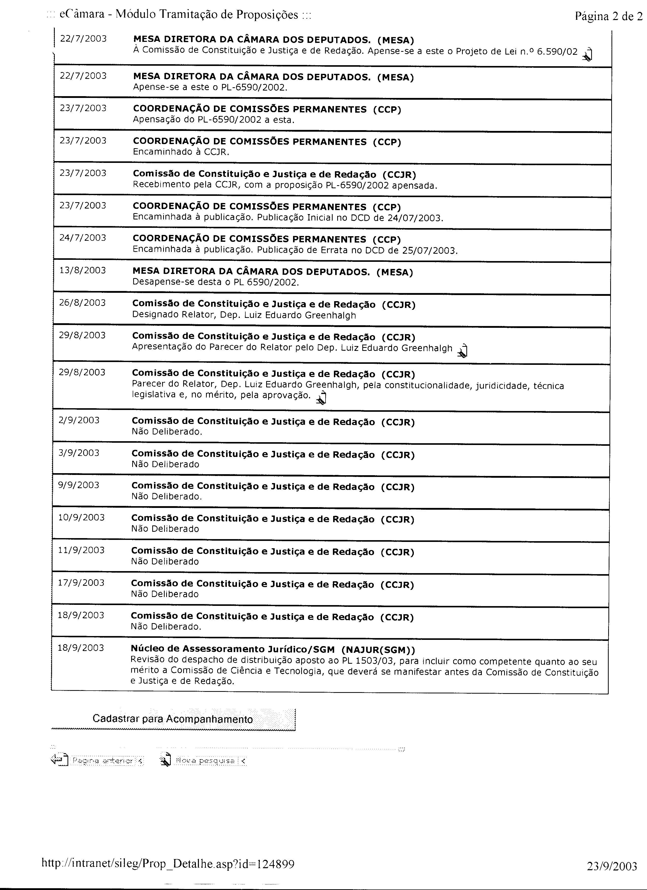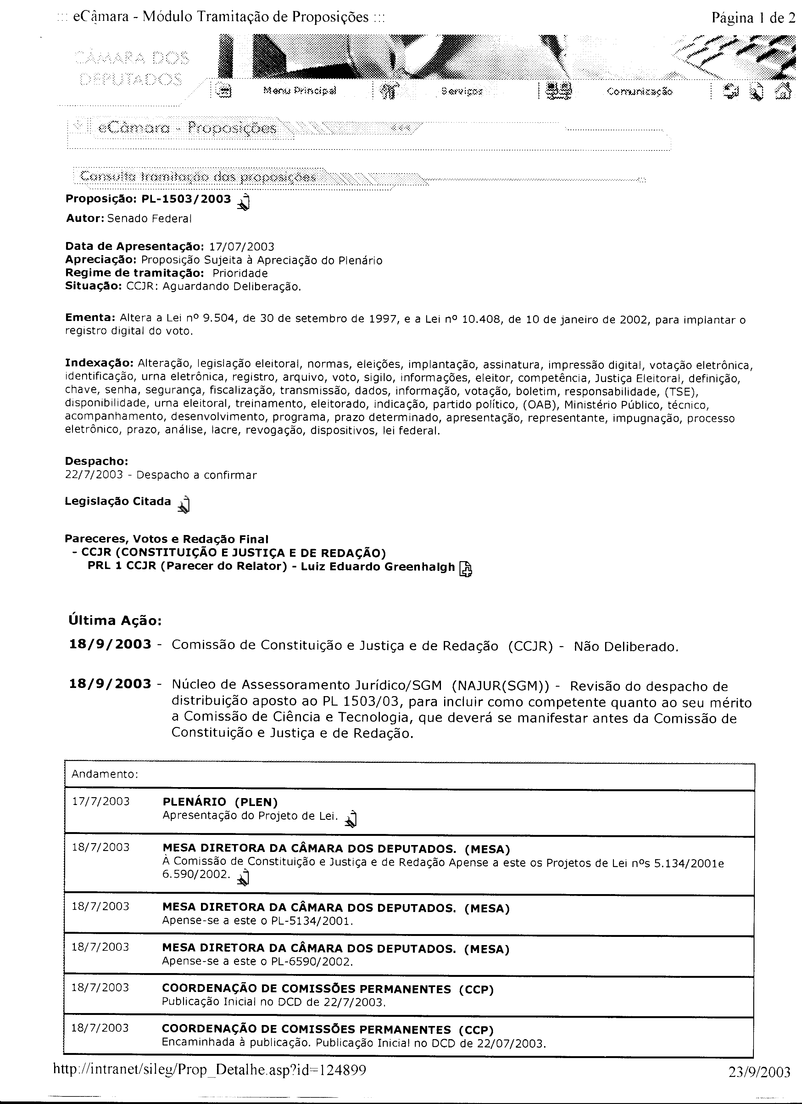 Documento 5 - Folha de acompanhamento do PL 1503/03 emitida em 23/09/2003 pelo Sistema de Consulta de Proposições do eCâmara, com registro de 18/09 feito pelo Núcleo de Assessoramento Juridico da Secretaria Geral da Mesa (NAJUR-SGM) para incluir a Comissão de Ciência e Tecnologia - CCTIC - para se manivestar